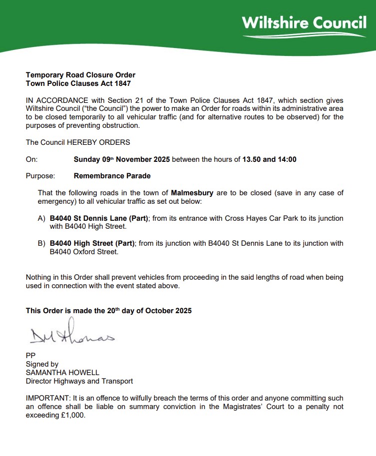 Road Closure - Remembrance Parade - Sunday 9th November 2025
